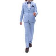 Najnowszy chłopięcy garnitur komunijny błękitny , idealny na uroczystość Pierwszej Komunii Świętej. Wykonany jest z gładkiej tkaniny garniturowej w pastelowym kolorze.