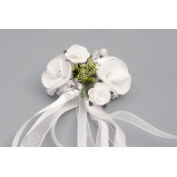 Stroik na świecę wykonany z kwiatów . Dodatkowo stroik udekorowany jest kilkoma wstążkami, które nadają ciekawszy, bogatszy wygląd. Z tyłu stroika wszyta jest gumka na tiulu,co idealnie pozwala dopasować  do świecy komunijnej i umożliwia łatwe zakładanie jak i zdejmowanie.
